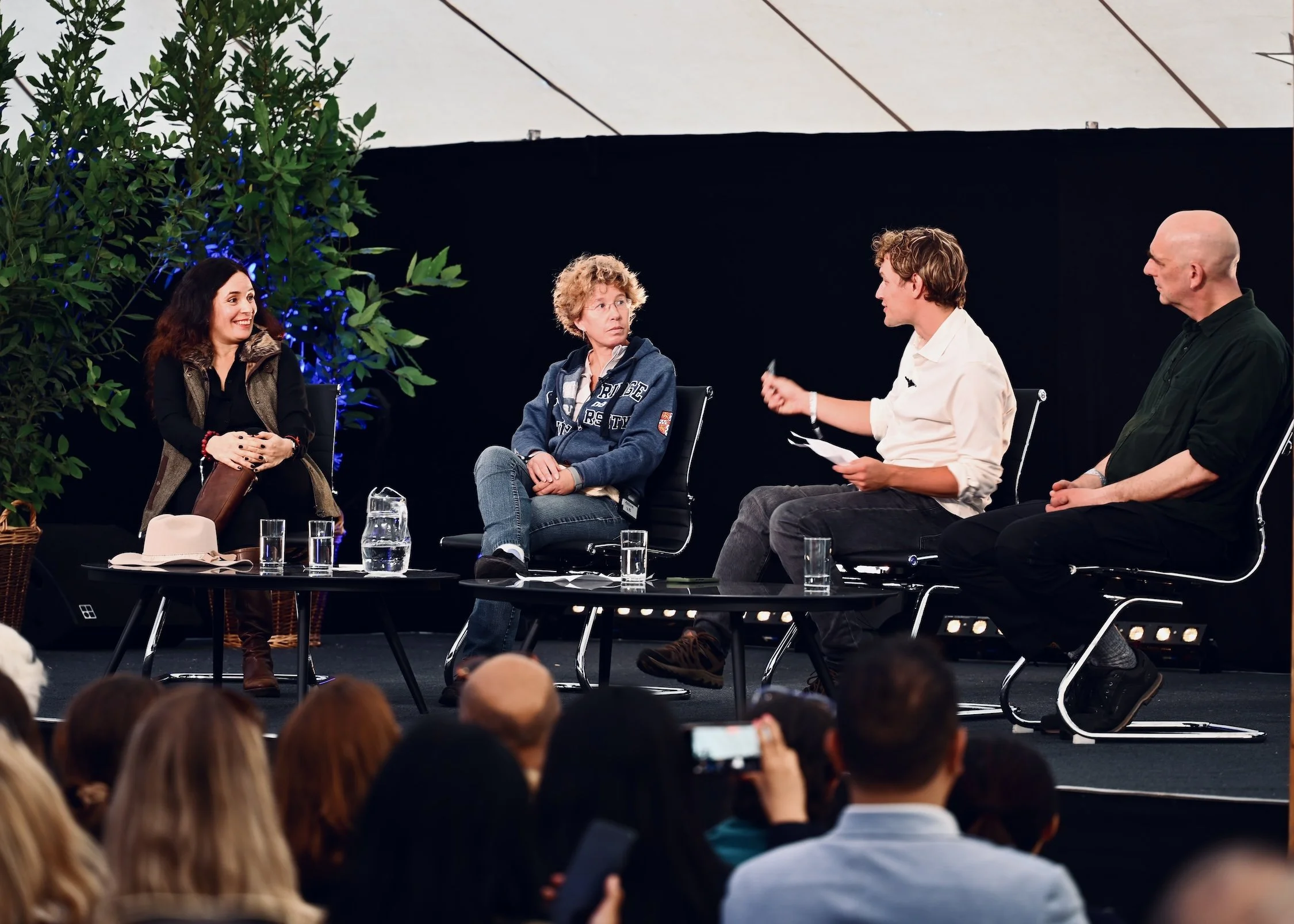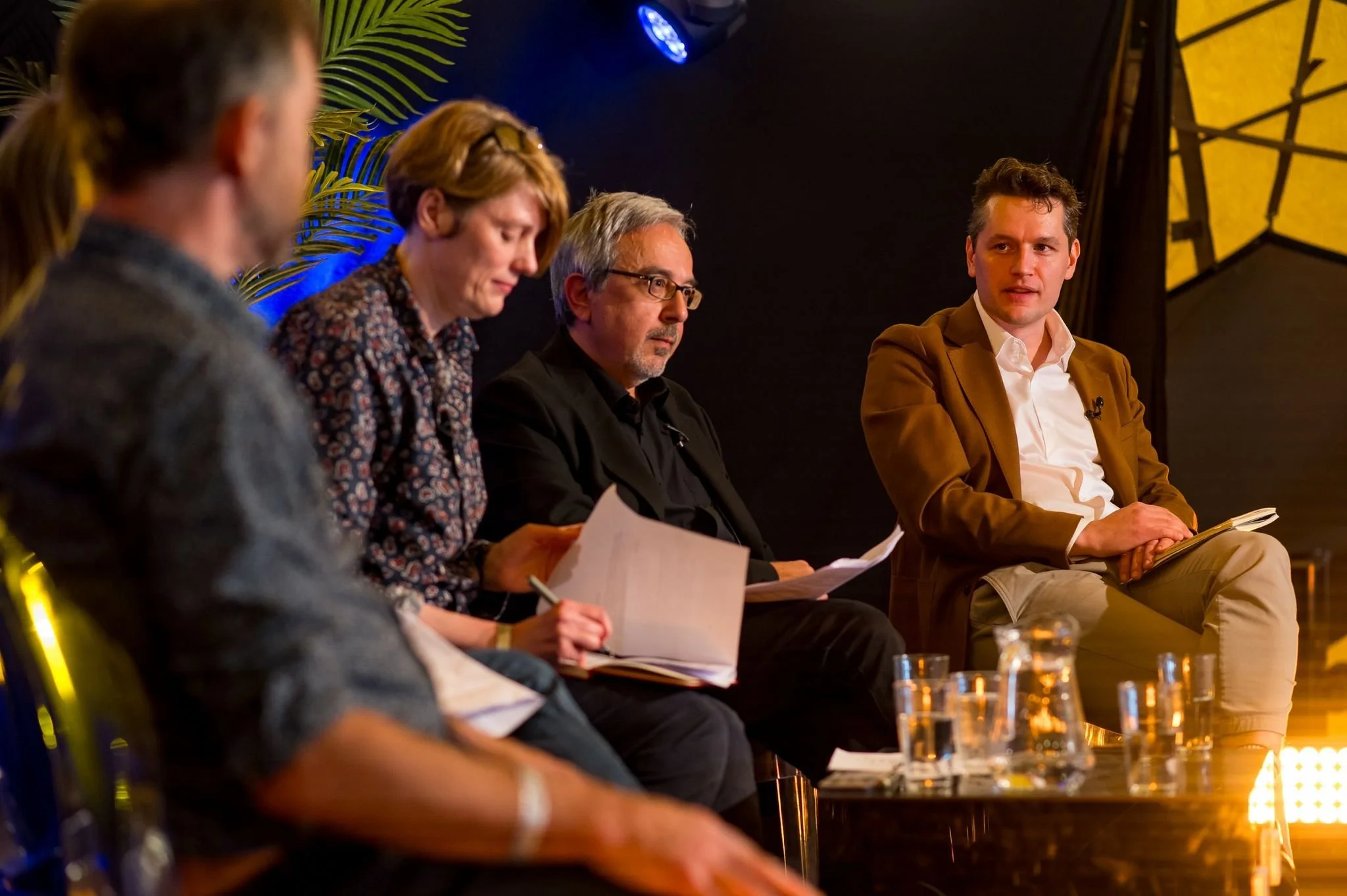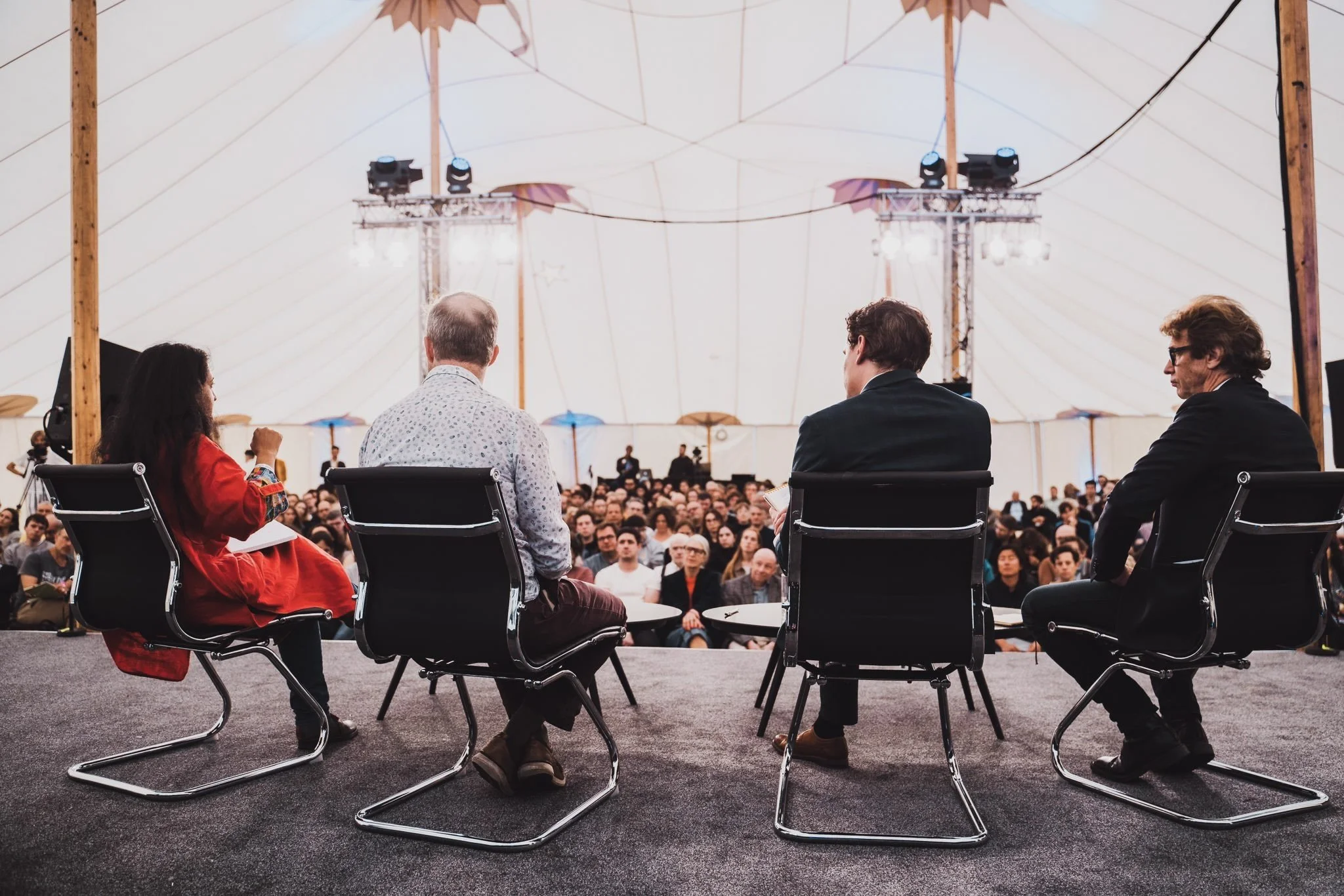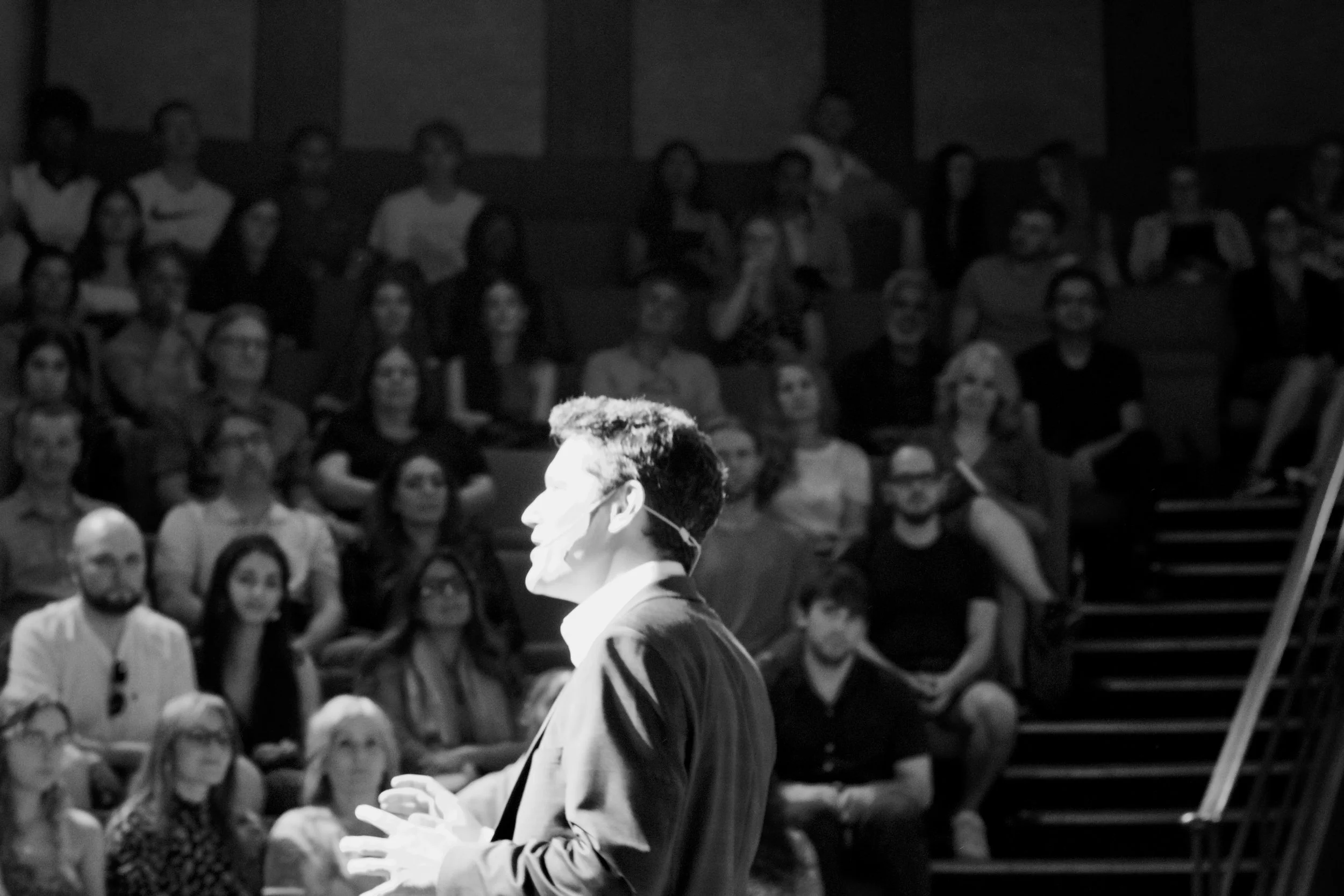 A gallery of photographs featuring philosopher Jack Symes at talks, festivals, and media appearances.