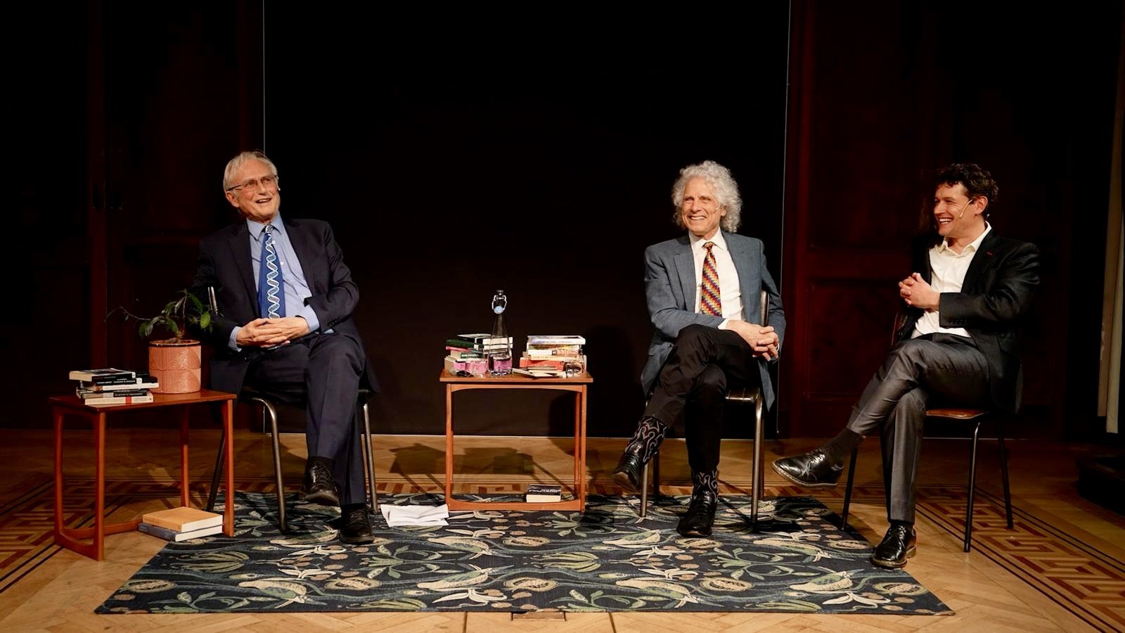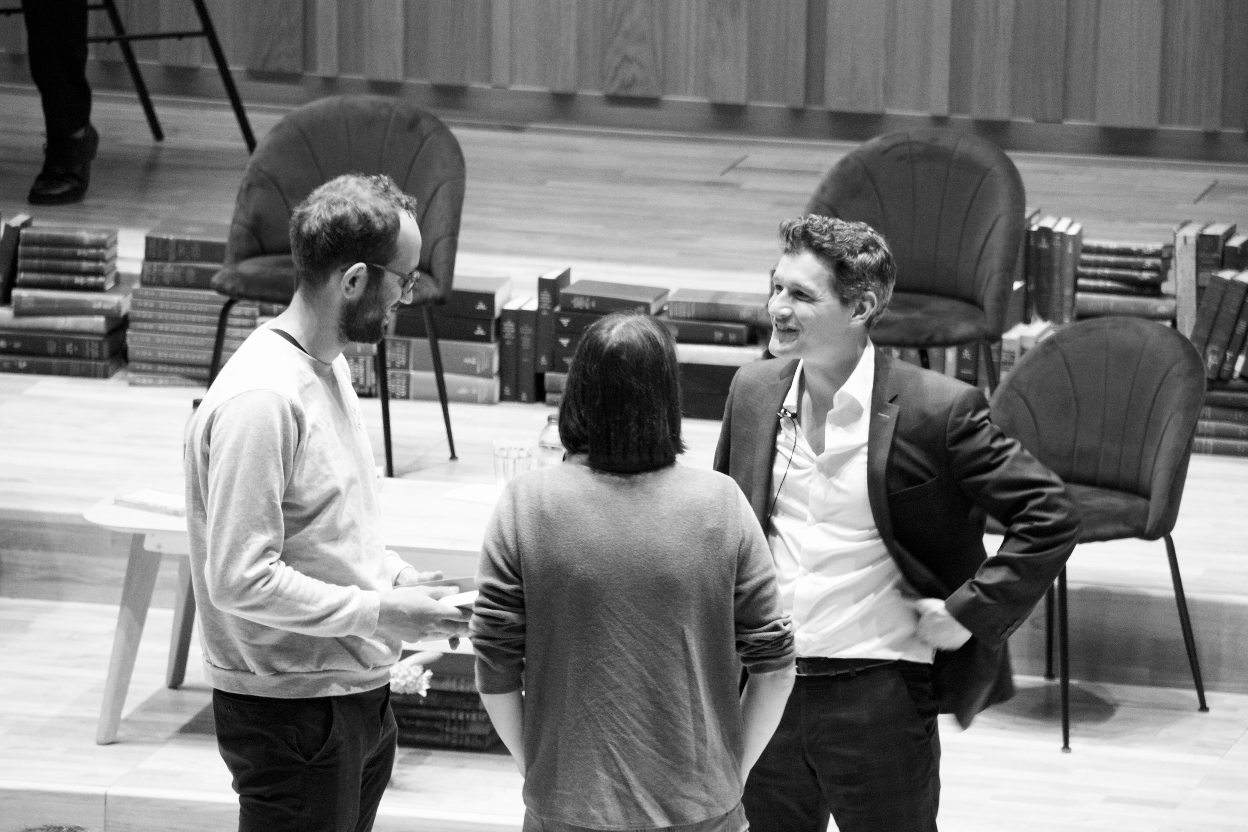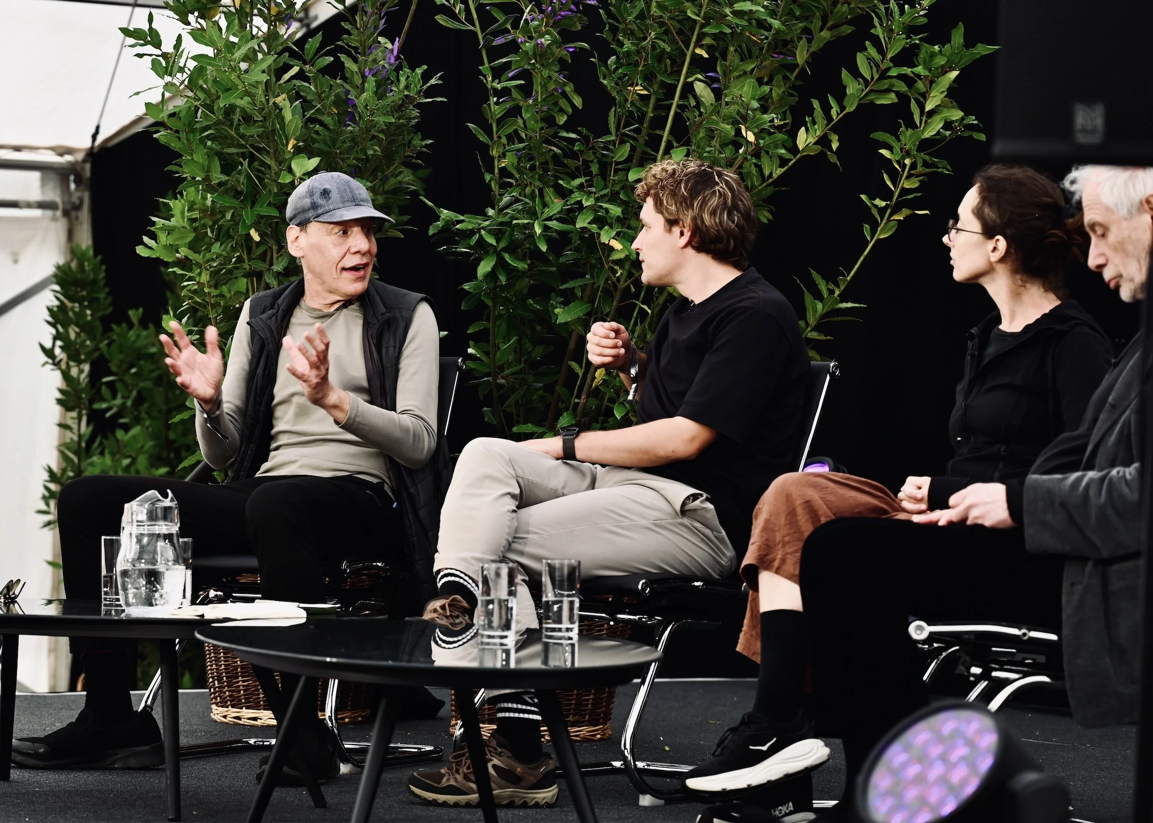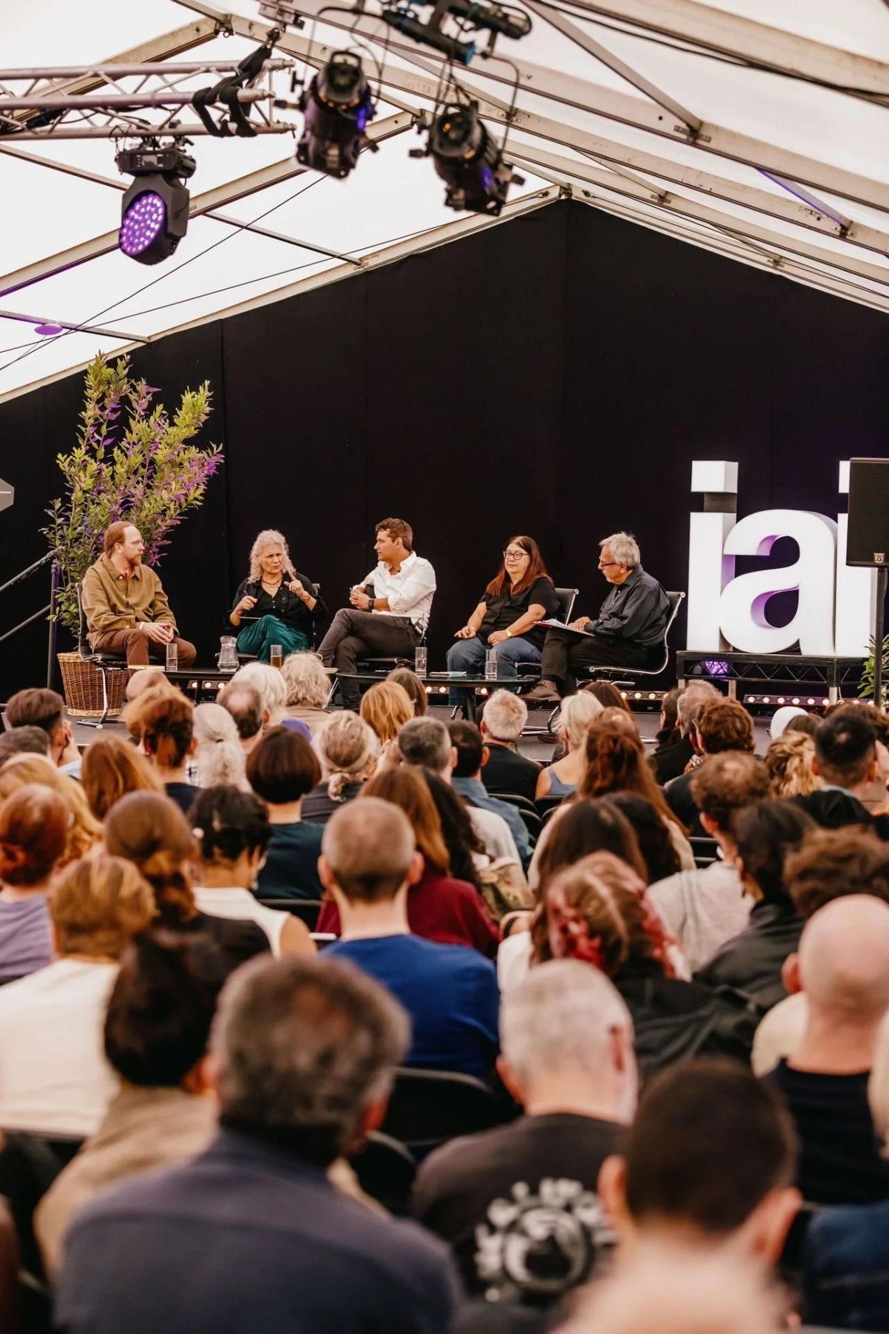 A gallery of photographs featuring philosopher Jack Symes at talks, festivals, and media appearances.